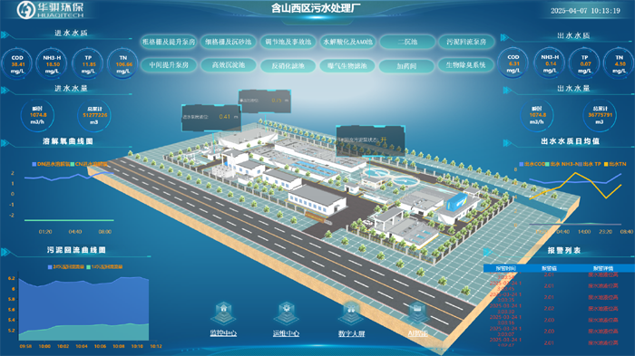 含山西區(qū)污水處理廠利用 3D引擎與數(shù)字孿生技術(shù),對廠區(qū)進行全工藝流程建模,精準(zhǔn)復(fù)現(xiàn)格柵池、生化反應(yīng)池、二沉池等核心工藝段的運行狀態(tài)。通過實時映射物理水廠的流量、壓力、溶解氧等關(guān)鍵參數(shù),并結(jié)合水務(wù)工藝數(shù)字化仿真算法,管理人員可在虛擬環(huán)境中模擬工藝調(diào)整、故障排查等場景,實時進行“所見即所得”的遠(yuǎn)程調(diào)控。例如,在曝氣環(huán)節(jié)異常波動時,系統(tǒng)可自動生成3D可視化報警與優(yōu)化建議。