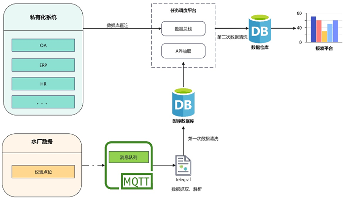 華騏環(huán)保以含山西區(qū)污水處理廠為試點,率先建成“全數(shù)字化運營水廠”,通過引入高性能時序數(shù)據(jù)庫實現(xiàn)對設(shè)備狀態(tài)、運行參數(shù)、水質(zhì)監(jiān)測、水量計算、能耗與藥耗等海量數(shù)據(jù)的高并發(fā)采集與傳輸,并通過分庫、分表架構(gòu)并結(jié)合不同工藝結(jié)構(gòu)完成多源異構(gòu)數(shù)據(jù)的統(tǒng)一存儲與快速響應(yīng)。整體技術(shù)架構(gòu)不僅解決了傳統(tǒng)水廠數(shù)據(jù)孤島問題,更通過標(biāo)準(zhǔn)化數(shù)據(jù)接口為上層智能應(yīng)用提供“原料”,達(dá)成智能化決策輸出。目前,數(shù)據(jù)平臺日均處理全自營廠數(shù)據(jù)量超百萬條,統(tǒng)一存儲運行數(shù)據(jù)達(dá)38億條,為后續(xù)的算法提優(yōu)與模型泛化奠定了堅實的數(shù)字化基礎(chǔ)。