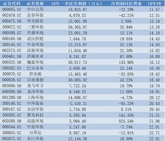 界面新聞梳理了全部環(huán)保板塊上市公司一季報業(yè)績以及當前情況下的市盈率水平,具體情況如下表所示(下表中“預測PE”為根據多家券商一致性預測出的2018年凈利潤及5月7日收盤價所計算出的市盈率):