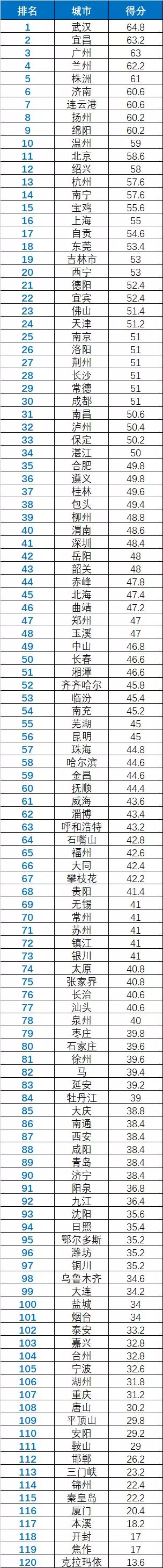 2019年,環(huán)保公益組織公眾環(huán)境研究中心通過搜集政府公開信息,對全國120個環(huán)保重點城市的水質(zhì)信息公開進(jìn)行評價,該表為水質(zhì)信息公開指數(shù)排名,排名越靠前公開質(zhì)量越高。