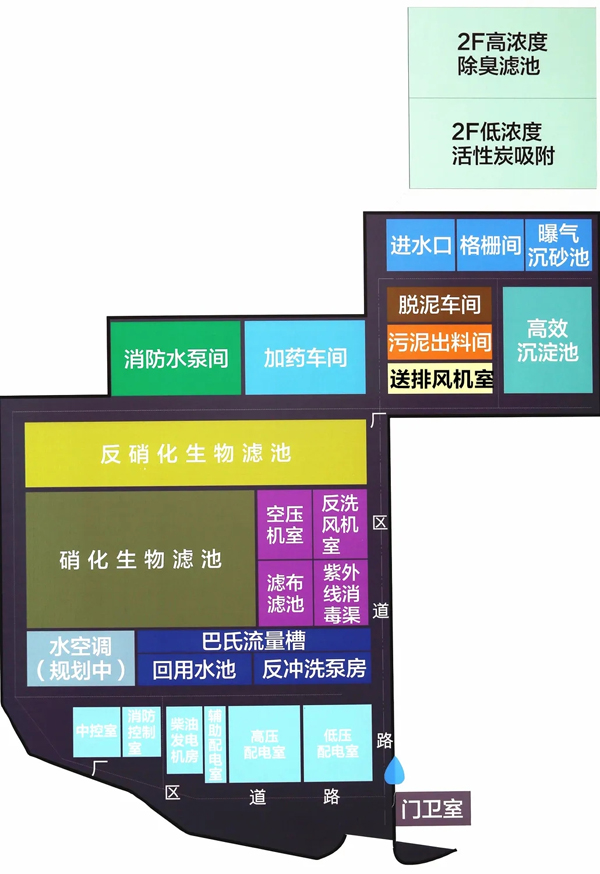污水廠加蓋封閉除臭,華騏環(huán)保采用了高、低濃度兩套除臭系統(tǒng),高濃度臭氣采用生物濾池除臭,低濃度臭氣采用活性炭吸附除臭,尾氣通過綜合大樓專用排放管道100m高空排放,有效解決了臭氣對周邊居民的影響,衛(wèi)生防護(hù)距離縮小至零。