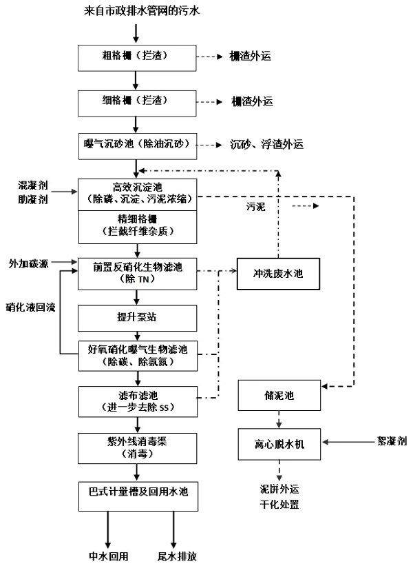 來自市政排水管網(wǎng)的污水先自流進(jìn)入粗格柵、細(xì)格柵,去除污水中較大雜質(zhì),然后進(jìn)入曝氣沉砂池內(nèi)進(jìn)一步除油沉砂。經(jīng)過預(yù)處理后的污水再進(jìn)入高效沉淀池,去除污水中的總磷和部分有機(jī)物。高效沉淀池出水經(jīng)過精細(xì)格柵進(jìn)一步攔截纖維雜質(zhì)后進(jìn)入前置反硝化生物濾池去除總氮,出水經(jīng)中間提升泵房提升至好氧硝化曝氣生物濾池,進(jìn)一步去除氨氮和有機(jī)物。曝氣生物濾池出水進(jìn)入濾布濾池進(jìn)一步去除懸浮物,再進(jìn)入紫外消毒渠進(jìn)行消毒處理,最后通過巴氏計(jì)量槽計(jì)量后尾水排放或中水回用。