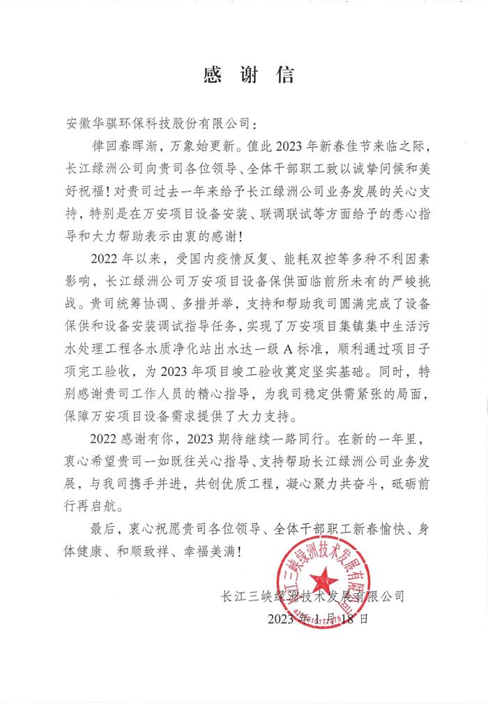 1月18日,長(zhǎng)江三峽綠洲技術(shù)發(fā)展有限公司向安徽華騏環(huán)保科技股份有限公司發(fā)來感謝信,對(duì)華騏環(huán)保積極參與江西省萬安縣城鄉(xiāng)水環(huán)境治理項(xiàng)目15個(gè)鄉(xiāng)鎮(zhèn)一體化污水處理設(shè)備安裝、聯(lián)調(diào)聯(lián)試等方面工作給予的悉心指導(dǎo)和大力幫助表示高度贊揚(yáng)與衷心感謝。
