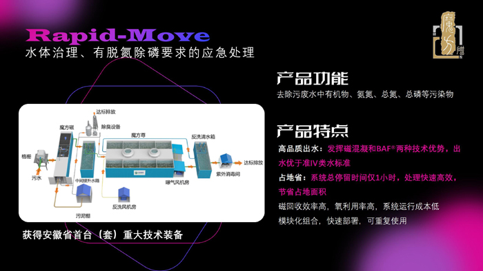 如遇同時要求脫氮除磷的提質(zhì)增效或應(yīng)急處理項目,可選用由魔方磁和魔方尊組合成的“Rapid-Move”系統(tǒng),該系統(tǒng)曾獲得安徽省首臺(套)重大技術(shù)裝備,其發(fā)揮了磁混凝和BAF兩種技術(shù)優(yōu)勢——系統(tǒng)總停留時間僅1小時,占地面積??;出水水質(zhì)為準(zhǔn)四類標(biāo)準(zhǔn);模塊化組合,快速部署,可重復(fù)利用。