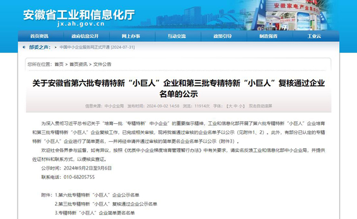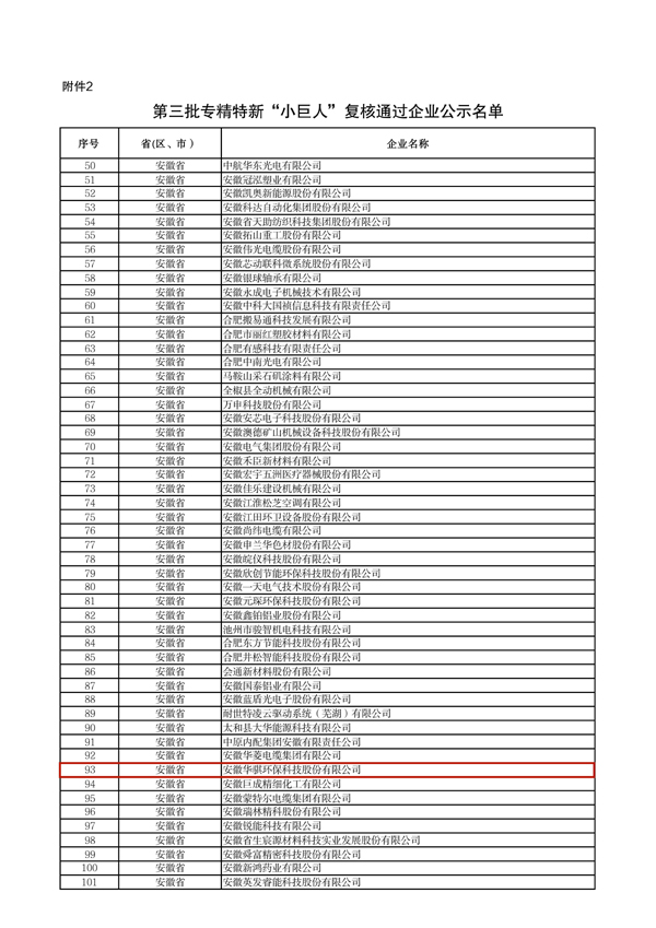 為深入貫徹習近平總書記關于“培育一批‘專精特新’中小企業(yè)”的重要指示精神,工業(yè)和信息化部于近日開展了第六批專精特新“小巨人”企業(yè)培育和第三批專精特新“小巨人”企業(yè)復核工作,安徽華騏環(huán)??萍脊煞萦邢薰就ㄟ^第三批專精特新“小巨人”企業(yè)復核并完成公示。