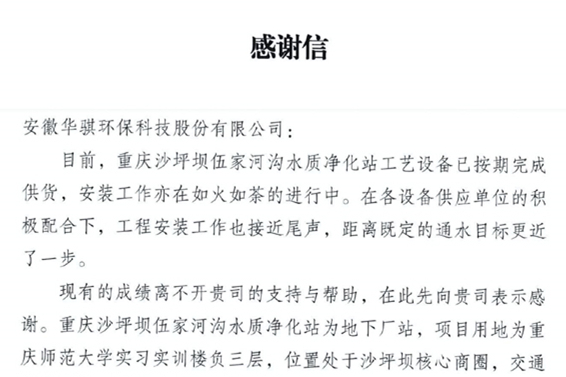 近日,長江三峽綠洲技術(shù)發(fā)展有限公司向安徽華騏環(huán)??萍脊煞萦邢薰景l(fā)來感謝信,對華騏環(huán)保工作人員在建設重慶沙坪壩伍家河溝水質(zhì)凈化站項目過程中,高效、有序的保障了項目…